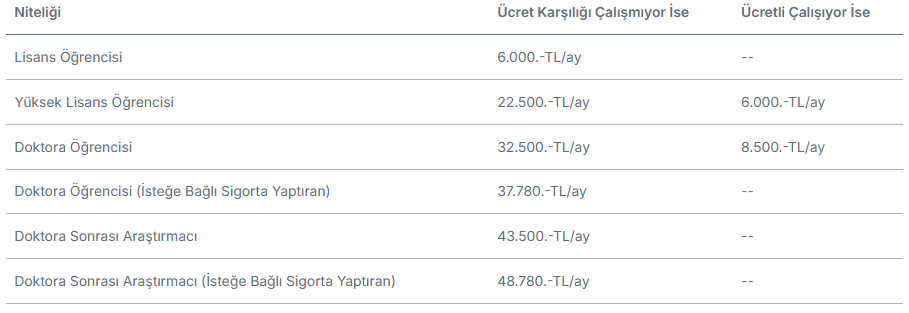 2026 yılı 1. dönemi itibariyle proje destek üst limiti (burs dahil, proje teşvik ikramiyesi (PTİ) ve kurum hissesi hariç) yıllık bütçe sınırlaması olmaksızın 3.000.000 TL’dir. Burslar ile ilgili üst sınırlar, 1 Ocak 2026 tarihinden itibaren geçerli olmak üzere aşağıda verilmiştir: